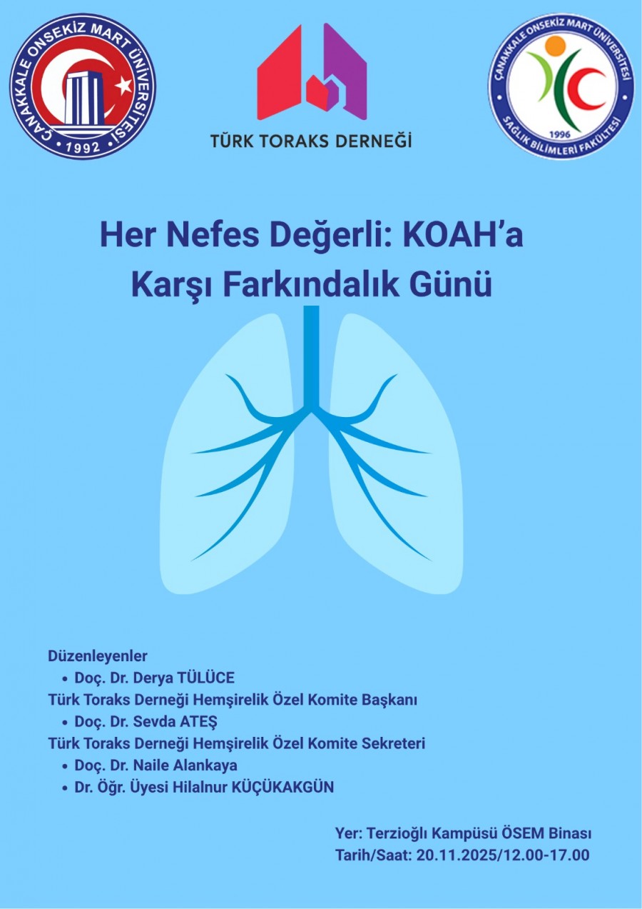 The Nursing Department, Internal Medicine Nursing Division, and the Turkish Thoracic Society Nursing Special Committee will jointly organize a booth event themed "Every Breath Counts: COPD Awareness Day" on November 20th, World COPD Day. All academic/administrative staff and students of our university are invited.