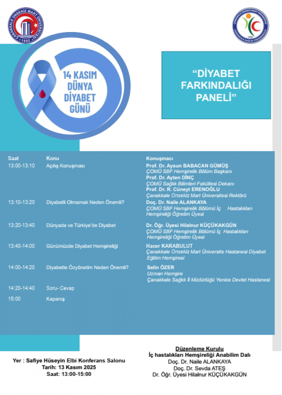 The Department of Internal Medicine Nursing will organize a "Diabetes Awareness Panel" in observance of "November 14, World Diabetes Day" on Thursday, November 13, 2025, from 1:00 PM to 3:00 PM at the Safiye Hüseyin Elbi Conference Hall. All academic/administrative staff and students of our university are invited.