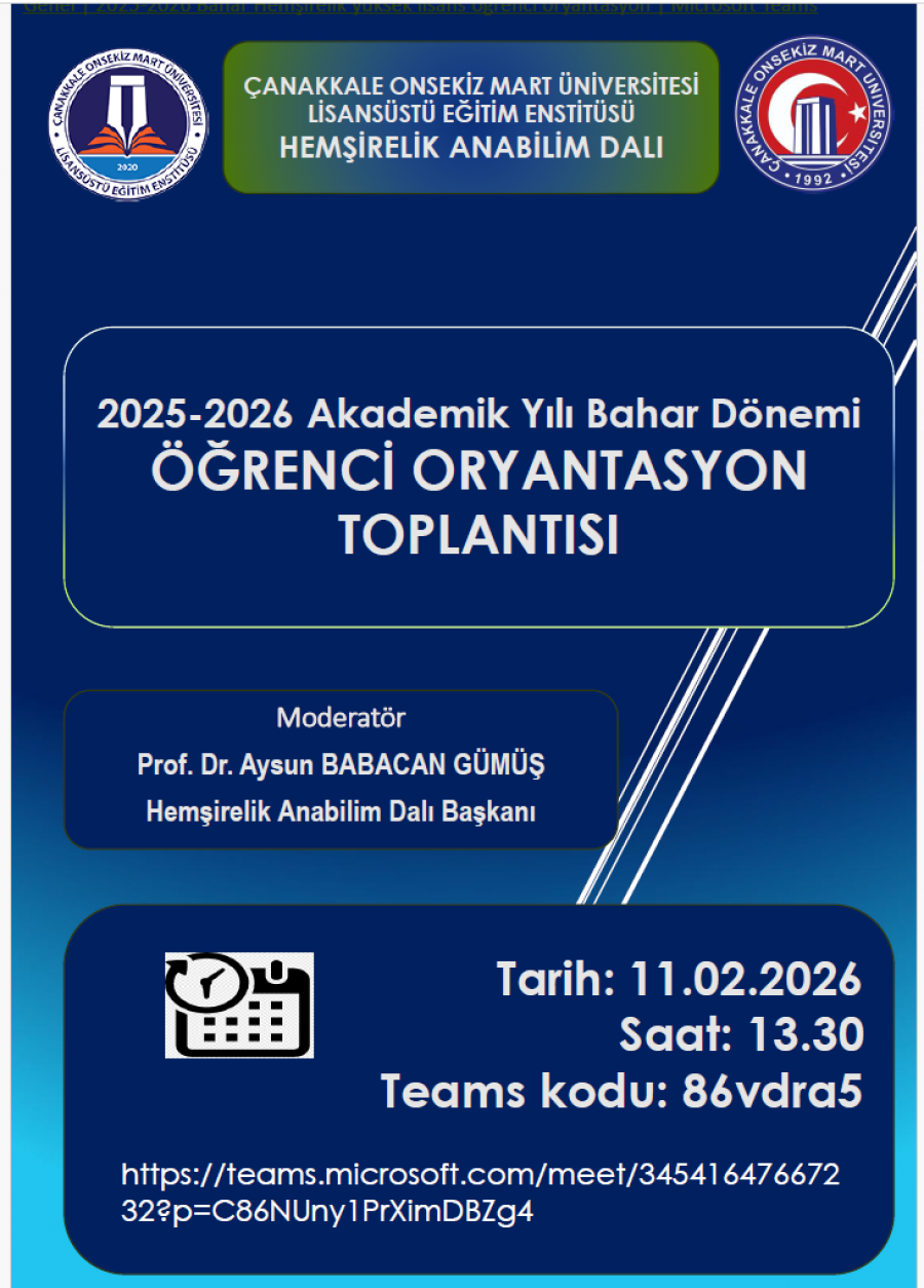An orientation meeting will be held for our newly enrolled students in the Nursing Department. The meeting will take place online on February 11, 2026, at 13:30. Meeting details are below: