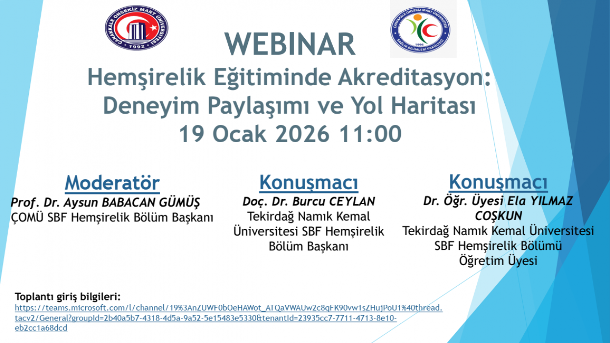 The webinar "Accreditation in Nursing Education: Sharing Experiences and Roadmap," moderated by Prof. Dr. Aysun Babacan Gümüş, and featuring Assoc. Prof. Dr. Burcu Ceylan, Head of the Nursing Department at Namık Kemal University Faculty of Health Sciences in Tekirdağ, and Dr. Ela Yılmaz Coşkun, will be held on January 19, 2026.