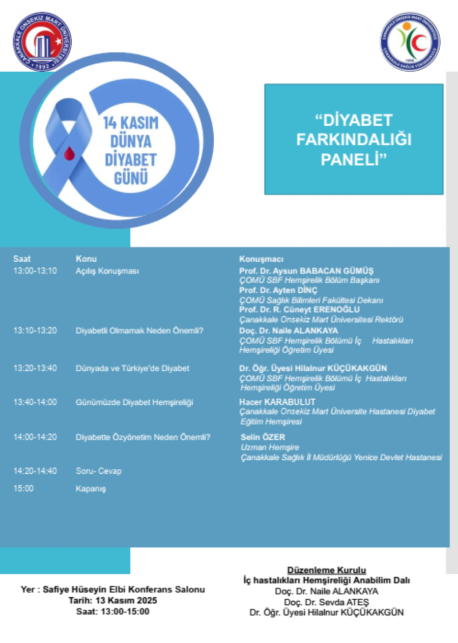 Hemşirelik Bölümü İç Hastalıkları Hemşireliği Anabilim Dalı tarafından “14 Kasım Dünya Diyabet Günü” kapsamında 13 Kasım 2025 Perşembe günü 13:00-15:00 saatleri arasında Safiye Hüseyin Elbi Konferans Salonunda “Diyabet Farkındalığı Paneli” düzenlenecektir. Üniversitemizin tüm akademik/idari personeli ve öğrencileri davetlidir.