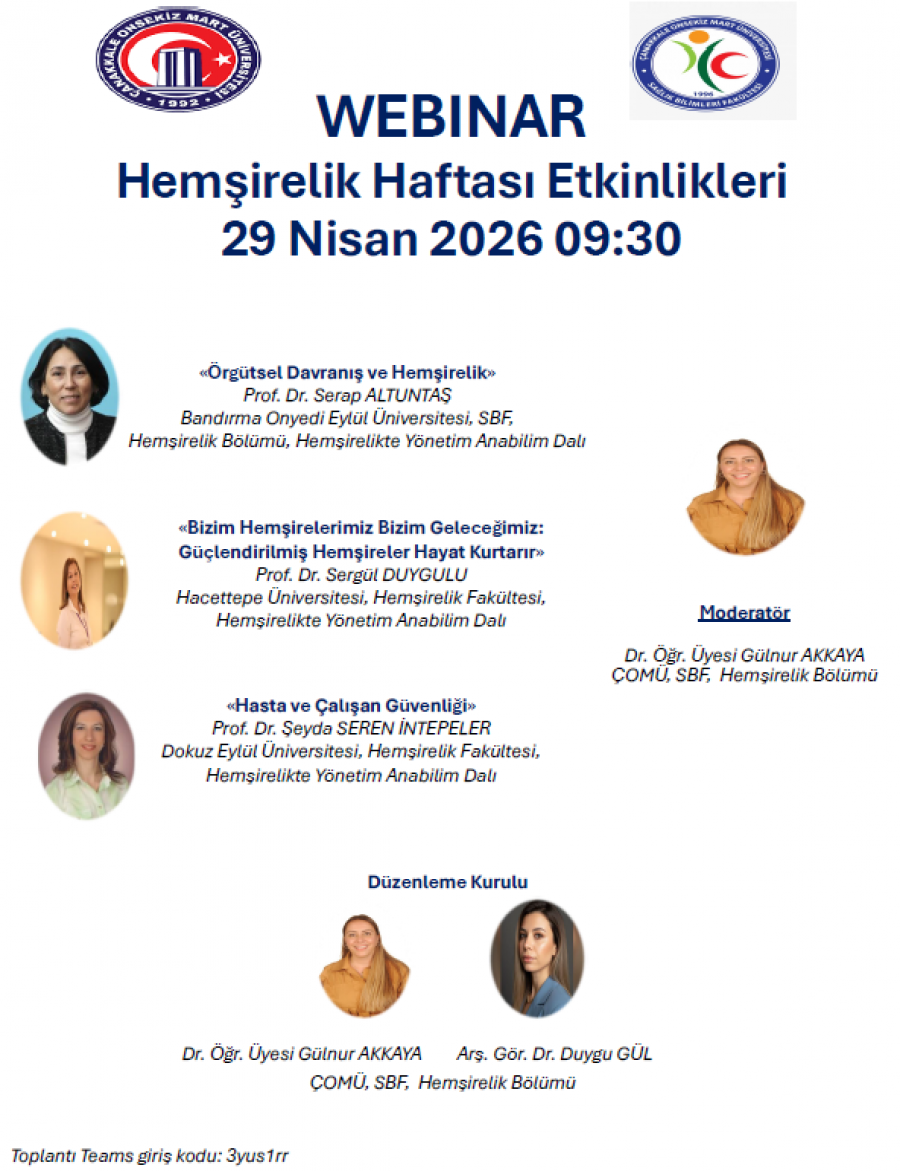 29 Nisan 2026 saat 09:30-12:30 da Hemşirelik Haftası Etkinliğine bütün öğrencilerimiz öğretim elemanlarımız davetlidir. Teams kodu : 3yus1rr